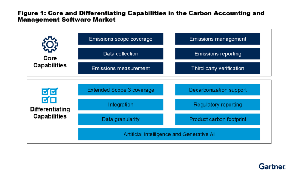 Gartner splits the market into two sets of capabilities: core and differentiating. Core capabilities are must-haves: the minimum viable product to deliver on carbon accounting requirements. Differentiating capabilities refer to capabilities that directly impact vendor selection.