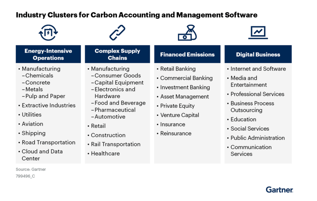 The Market Guide also elaborates on the four industry clusters and their subsets that require carbon accounting and management software: